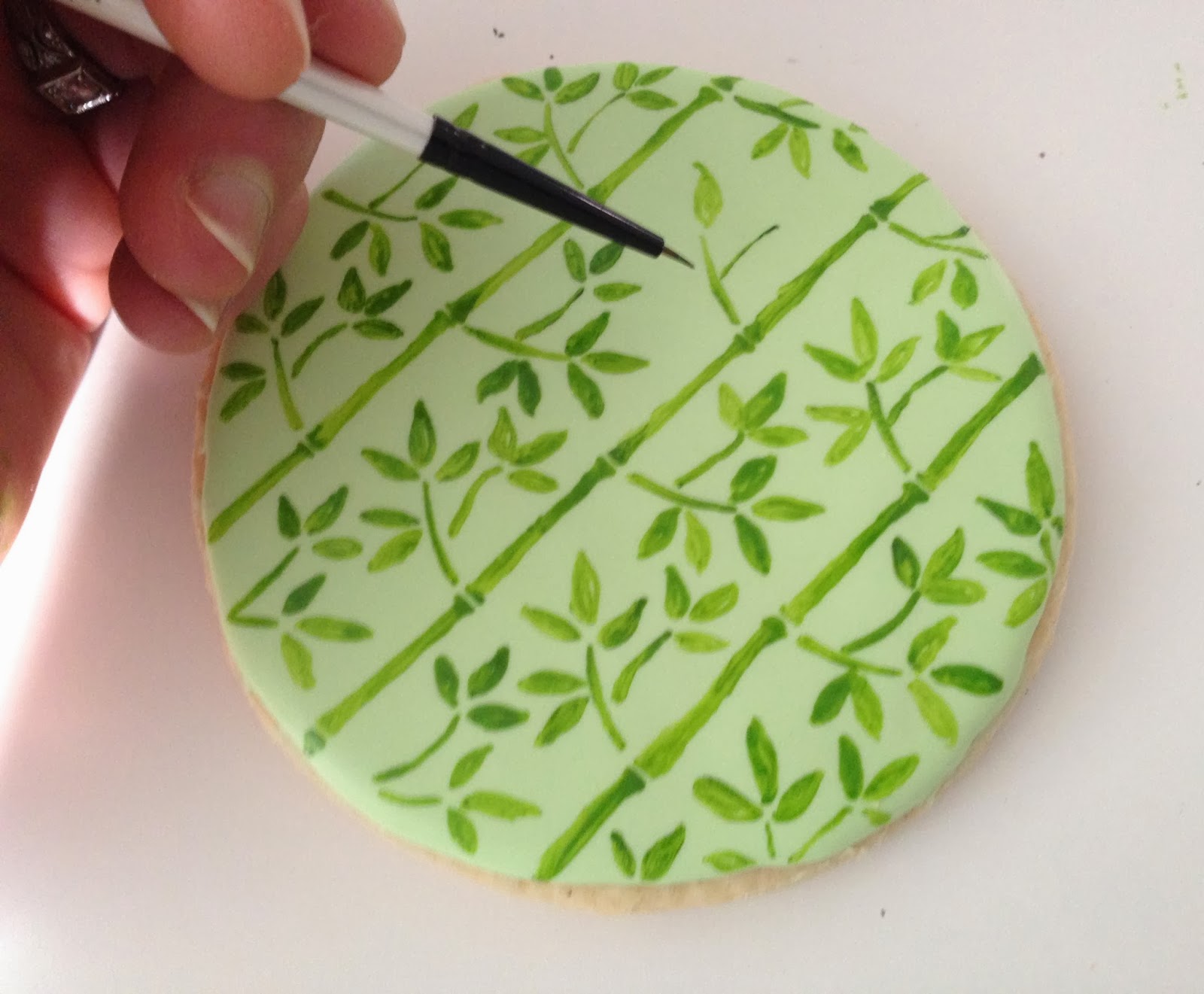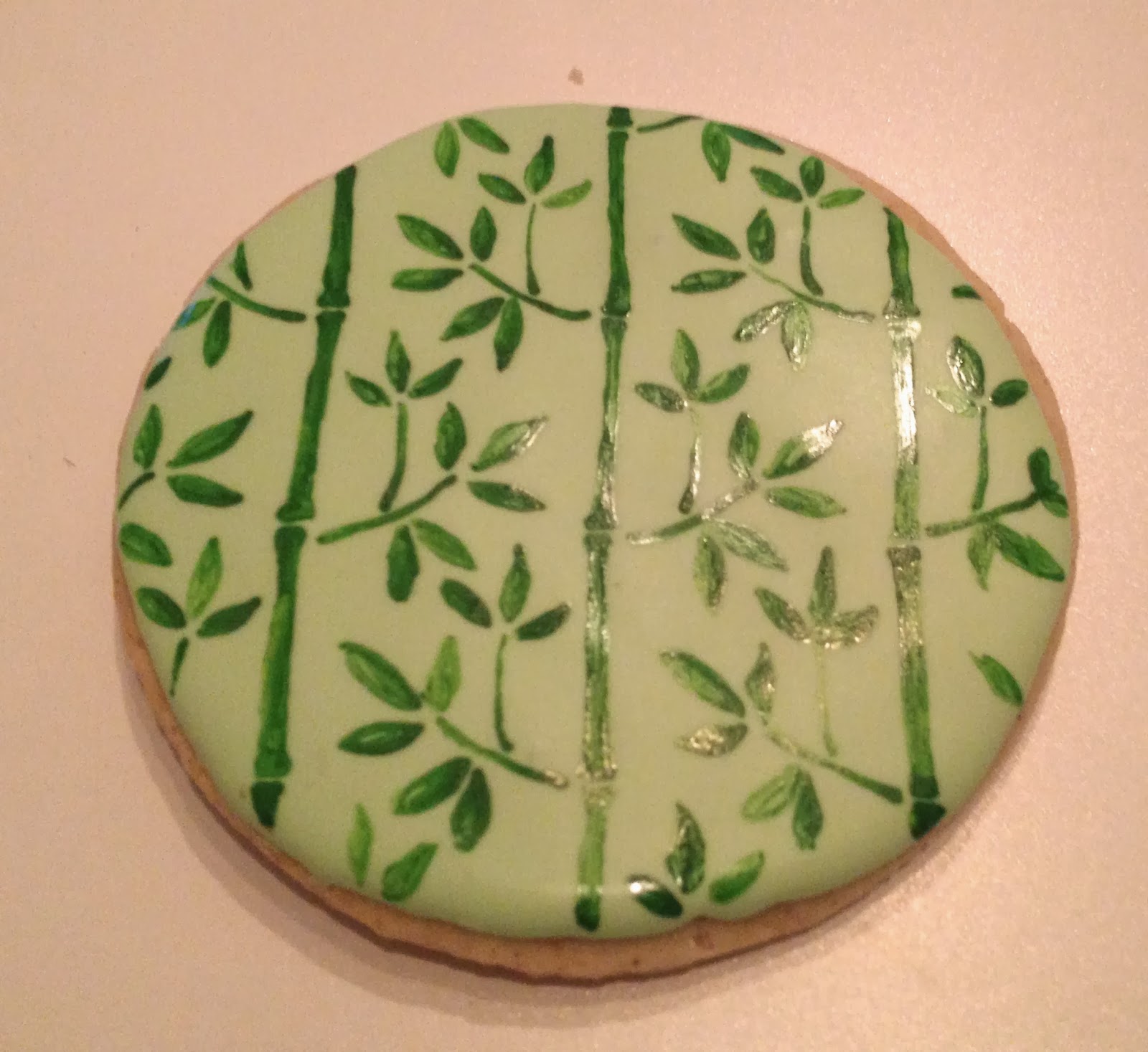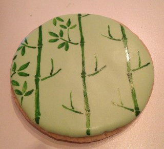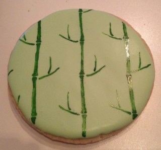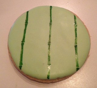 I decided almost immediately that I wanted to incorporate bamboo.  Black and white is a bit monotonous and green gives them a good punch of color.  I used food coloring to paint bamboo onto the cookies.  Here’s a brief tutorial: