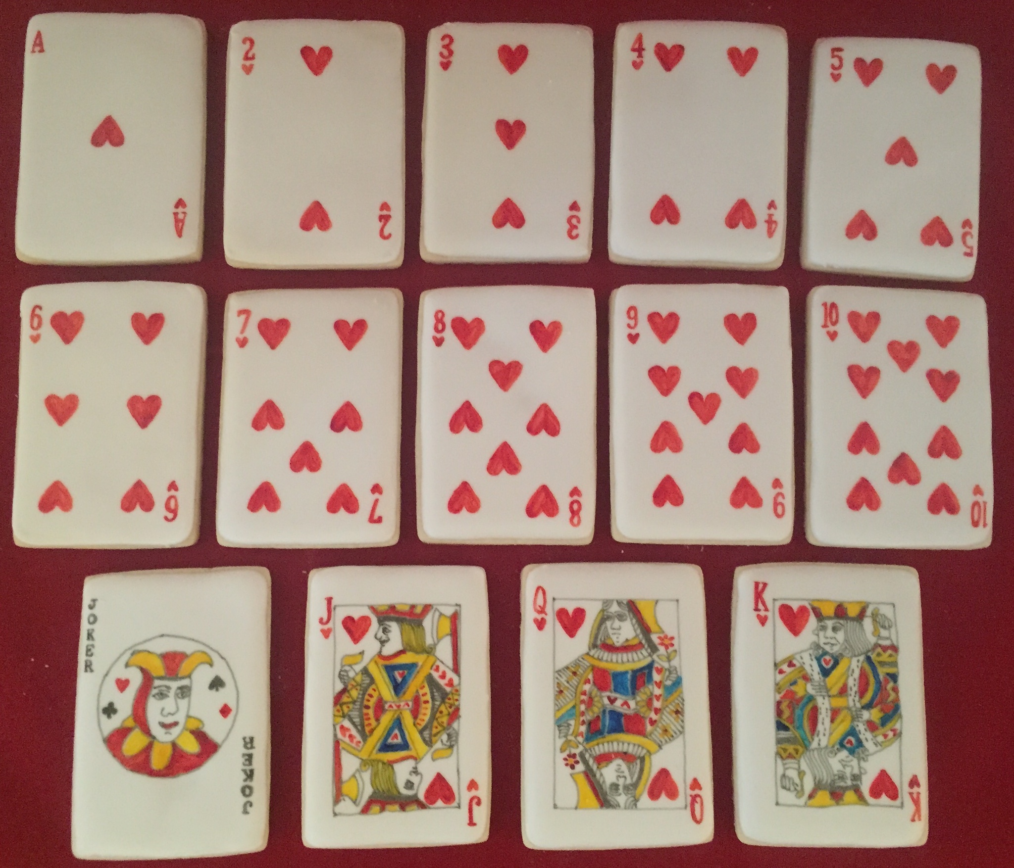 In honor of Superbowl Sunday, I am previewing round 1 of my 2015 Valentine cookies. I got the idea while I was watching my brother play cribbage. They are not the most romantic batch, but I think the concept is a fun twist on traditional “heart” cookies.