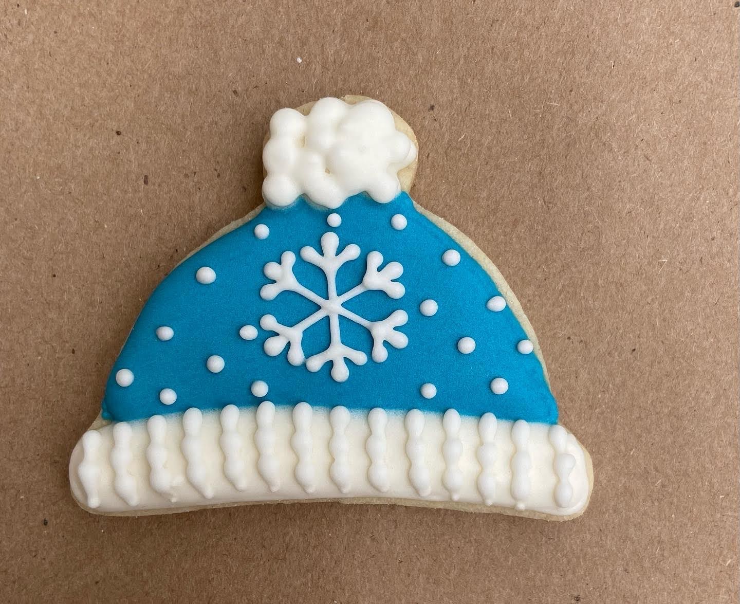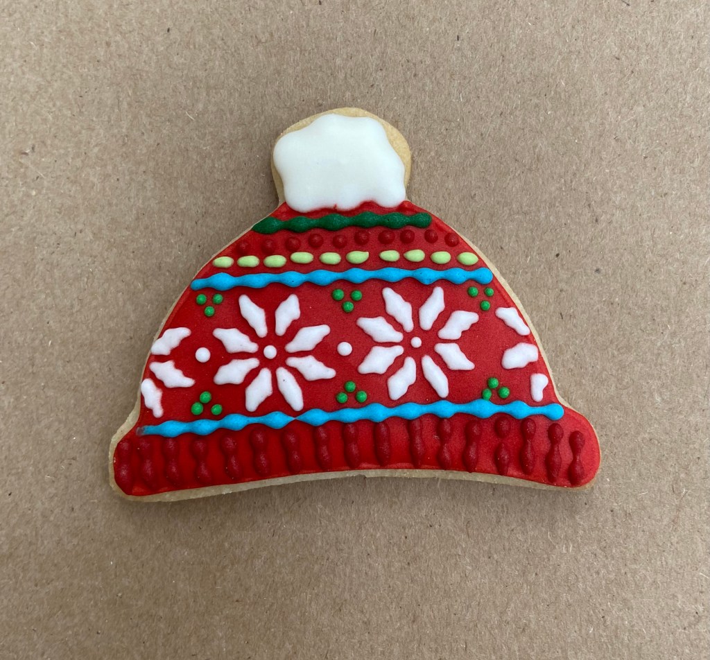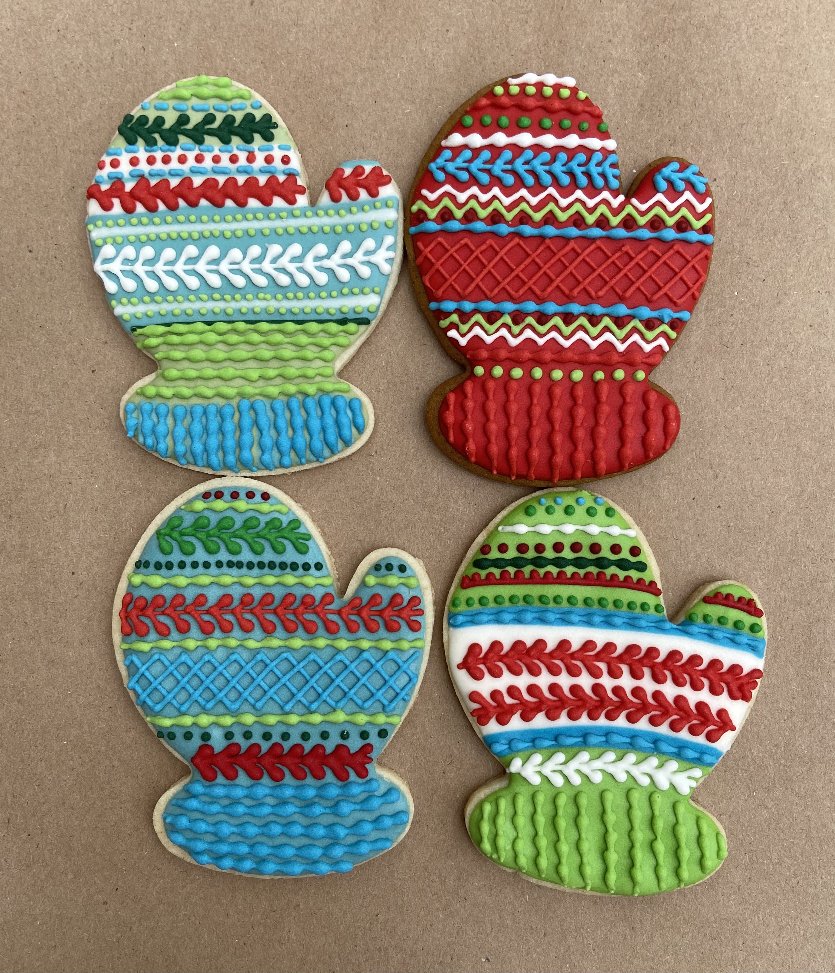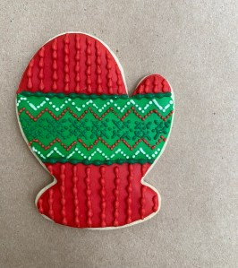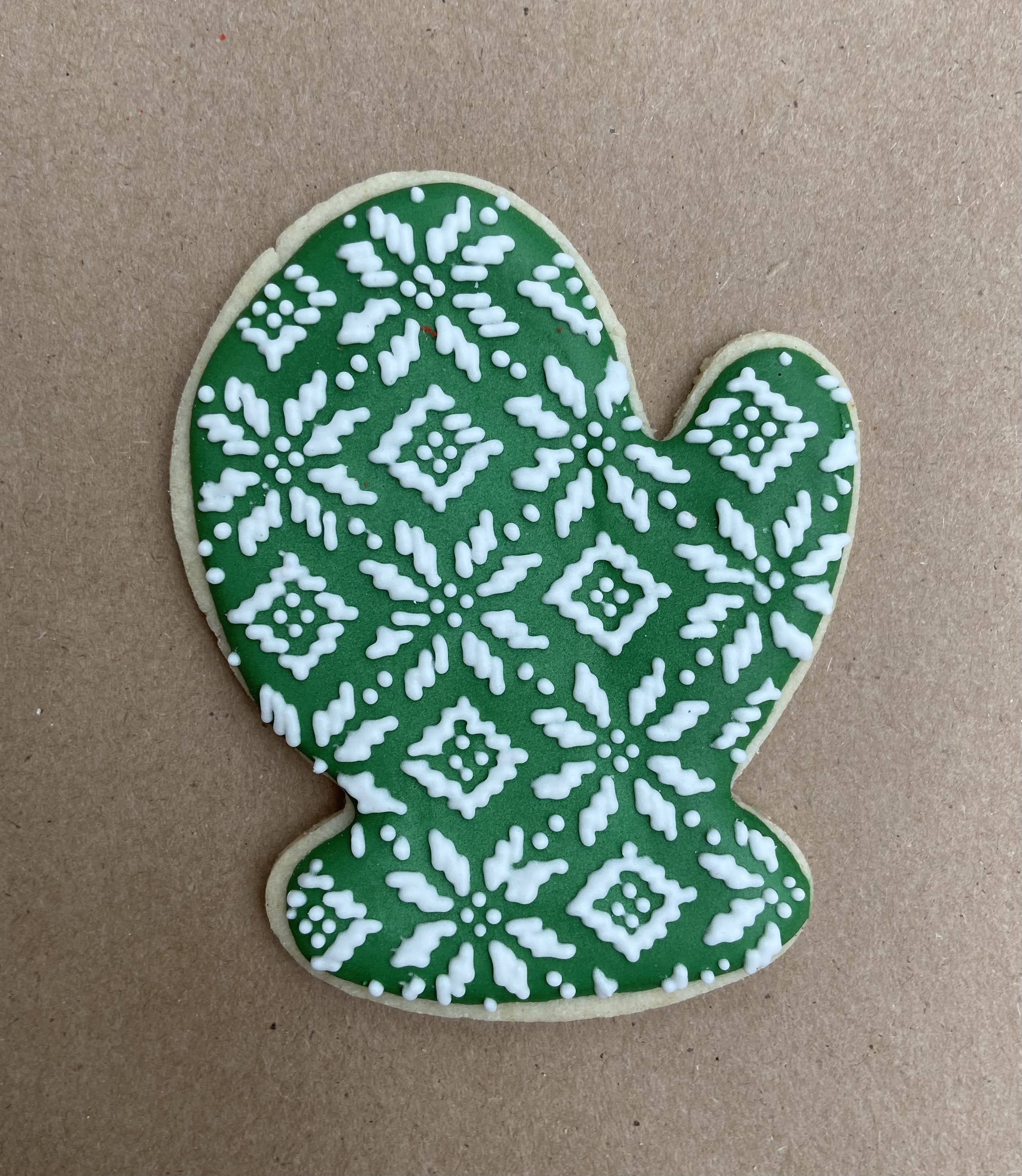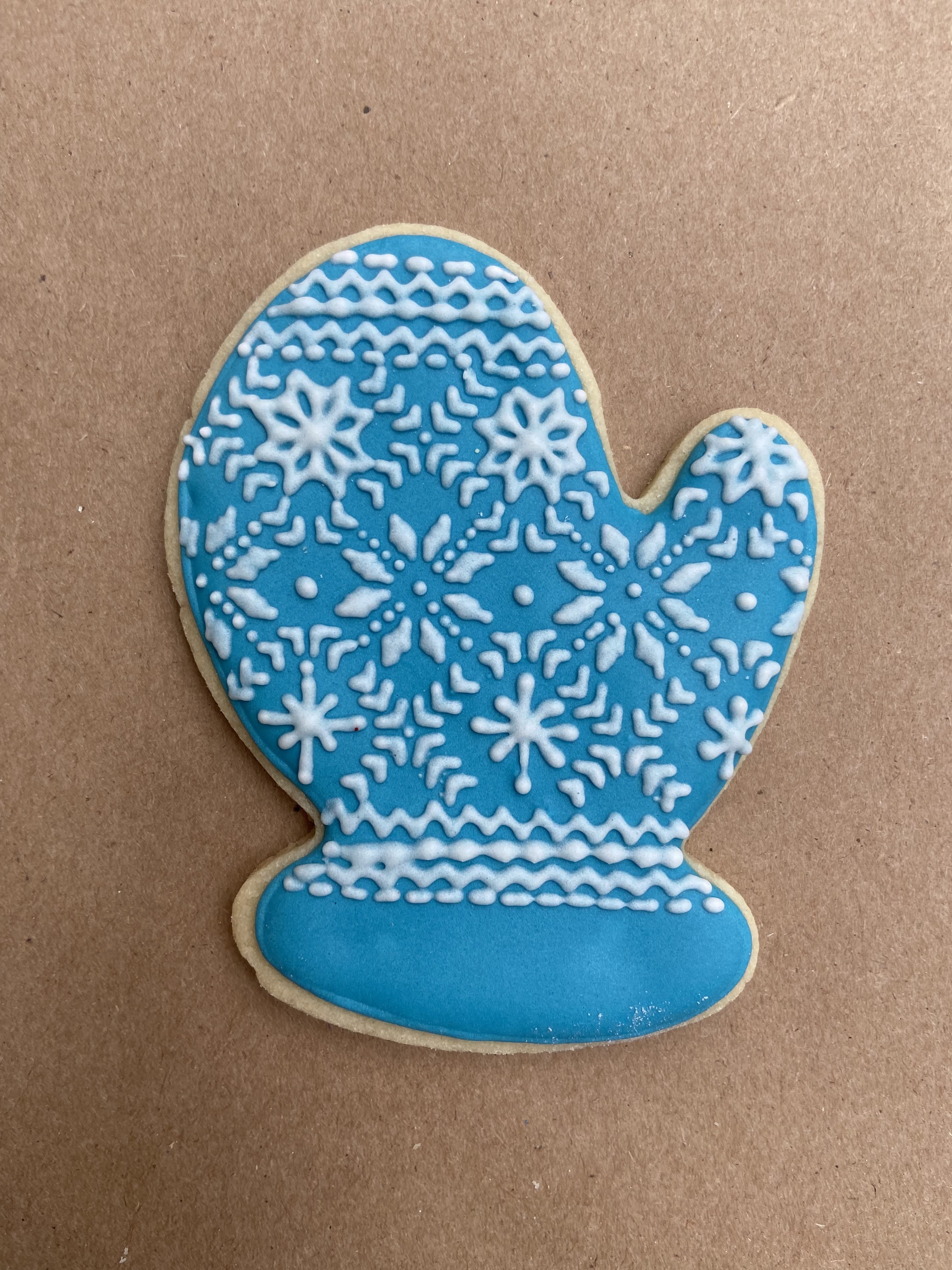 One of the benefits of my new cookie decorating environment was that I needed to create a design that was easy to do while participating/talking/engaging. Something simple and easy- a design that didn’t require much focus on my part. The designs below are made up of a series of lines and dots. They aren’t perfect (I can see where I had to stop mid-stream to look up or typed a message to a colleague.) But- not bad for This is the simple lines and dots fair isle pattern I invented during the groups: